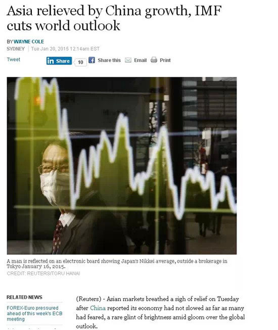 路透社1月20日報道稱中國經(jīng)濟發(fā)展腳步放緩程度仍舊保持在預期范圍內(nèi),并沒有許多人想象中的那樣嚴重,使得整個亞洲市場松了口氣。