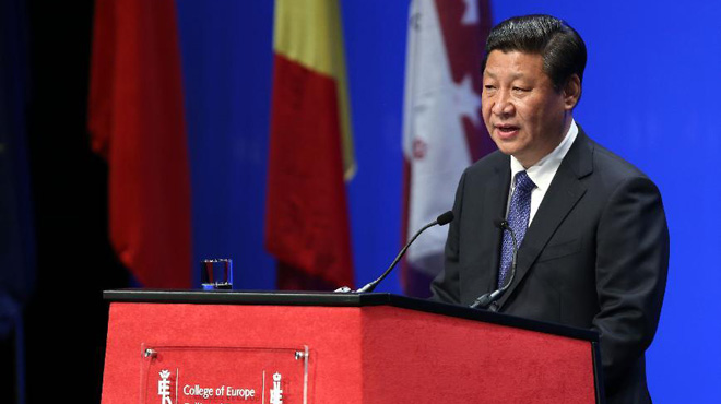 2014年4月1日,國(guó)家主席習(xí)近平在比利時(shí)布魯日歐洲學(xué)院發(fā)表重要演講。新華社記者龐興雷攝
