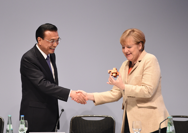 2014年10月10日,國(guó)務(wù)院總理李克強(qiáng)在柏林與德國(guó)總理默克爾共同出席第七屆中德經(jīng)濟(jì)技術(shù)合作論壇。這是在論壇上,李克強(qiáng)總理將一精巧的魯班鎖送給默克爾。(新華社記者李學(xué)仁攝)