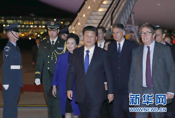 當(dāng)?shù)貢r間晚8時許,習(xí)近平乘坐的專機(jī)抵達(dá)倫敦希思羅機(jī)場。習(xí)近平和夫人彭麗媛在機(jī)場受到英國女王代表胡德子爵、外交大臣哈蒙德等熱情迎接。英國青年向習(xí)近平夫婦獻(xiàn)上鮮花。