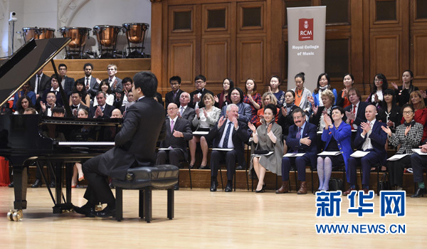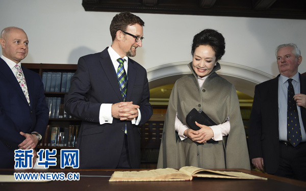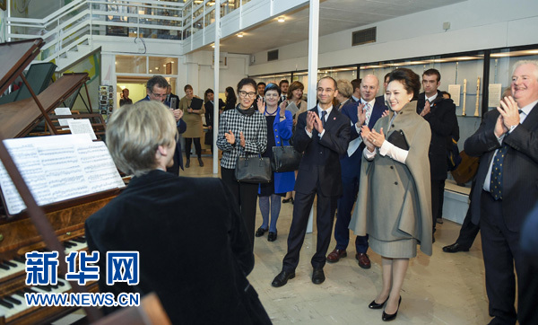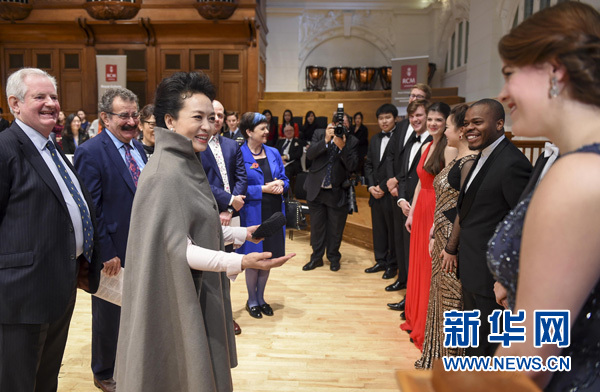 彭麗媛抵達(dá)時(shí),受到皇家音樂(lè)學(xué)院董事會(huì)主席溫斯頓勛爵、學(xué)院院長(zhǎng)、英國(guó)友人等熱烈歡迎。在院長(zhǎng)陪同下,彭麗媛欣賞了獲獎(jiǎng)學(xué)生和校友精彩的聲樂(lè)、器樂(lè)表演,參觀了樂(lè)器博物館,觀賞了圖書(shū)館珍藏的莫扎特、肖邦等音樂(lè)大師創(chuàng)作手稿,并同學(xué)院師生進(jìn)行交流。彭麗媛表示,音樂(lè)作為一種高尚的藝術(shù)形式,超越國(guó)家、民族、歷史、文化界限?;始乙魳?lè)學(xué)院培養(yǎng)出眾多世界級(jí)藝術(shù)家。中國(guó)有不少音樂(lè)作品享譽(yù)世界,希望皇家音樂(lè)學(xué)院今后加強(qiáng)同中國(guó)音樂(lè)院校的交流,為促進(jìn)中英教育和藝術(shù)合作貢獻(xiàn)力量。