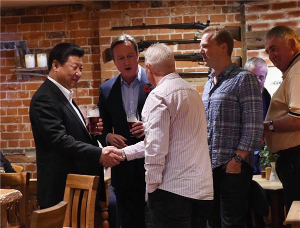 10月22日,國家主席習近平在契克斯首相鄉(xiāng)間別墅同英國首相卡梅倫再次會晤。會晤結束后,習近平在卡梅倫陪同下乘車前往當?shù)匦℃?zhèn)體驗酒吧文化。(新華社記者饒愛民攝)