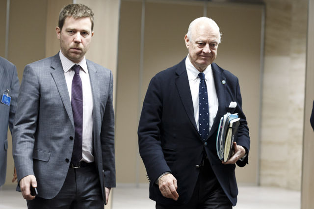 3月18日,在瑞士日內(nèi)瓦聯(lián)合國歐洲總部,聯(lián)合國敘利亞問題特使德米斯圖拉(右)準(zhǔn)備參加敘利亞問題新一輪和談。 新華社/美聯(lián)