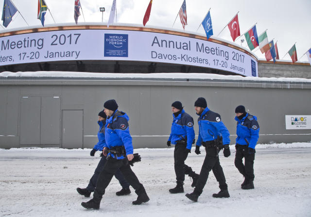 1月15日,在瑞士達(dá)沃斯,警察走過即將舉辦世界經(jīng)濟(jì)論壇年會(huì)的會(huì)議中心。(新華/美聯(lián))