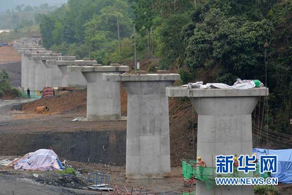 這是3月27日在老撾南塔省航拍的正在施工建設(shè)中的橋梁。新華網(wǎng)發(fā) 劉艾倫攝
