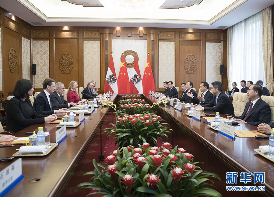 李克強歡迎范德貝倫總統(tǒng)和庫爾茨總理聯(lián)袂訪華。他表示,奧地利是中國在歐洲的重要伙伴。習近平主席同總統(tǒng)先生舉行會談,共同規(guī)劃兩國關系未來發(fā)展。中方愿同奧方抓住機遇,對接發(fā)展戰(zhàn)略,深化人文交流合作,加強在國際事務中的溝通協(xié)調,全面提升兩國關系水平。