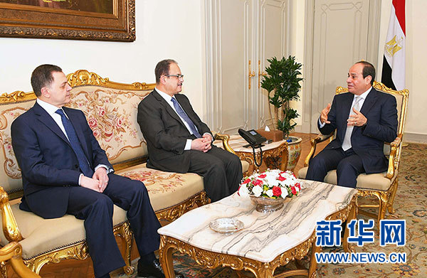 6月14日,在埃及首都開羅,埃及總統(tǒng)塞西(右一)和本屆內(nèi)閣新當(dāng)選成員內(nèi)政部長馬哈茂德·陶菲克(左一)、前任內(nèi)政部長阿卜杜勒·加法爾(左二)交談。新華社/中東社
