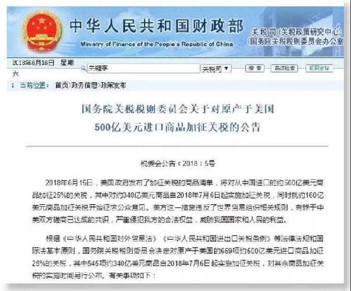 6月15日,美國(guó)政府不顧中美雙方達(dá)成的共識(shí),發(fā)布對(duì)價(jià)值500億美元中國(guó)商品加征25%關(guān)稅的商品清單,嚴(yán)重侵犯和損害中國(guó)和中國(guó)人民的合法權(quán)益。隨后,中方依據(jù)相關(guān)法律發(fā)布公告,對(duì)原產(chǎn)于美國(guó)的659項(xiàng)約500億美元進(jìn)口商品加征25%的關(guān)稅。2018-06-16 13:07:18