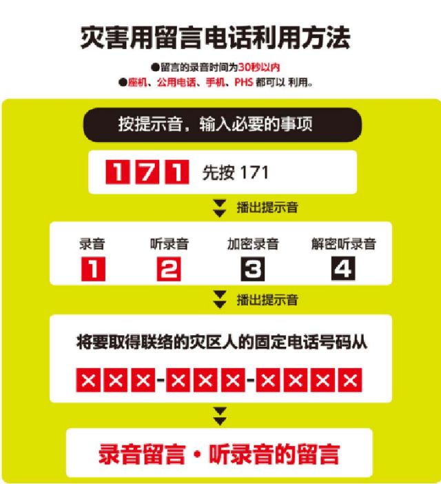 強震往往造成通信中斷。為方便民眾震后互相確認平安,日本政府設置了災害用留言電話。若震后通信中斷,可撥打171留言或收聽親友留言,英文版介紹請見:http://www.ntt-east.co.jp/en/saigai/voice171/index.html