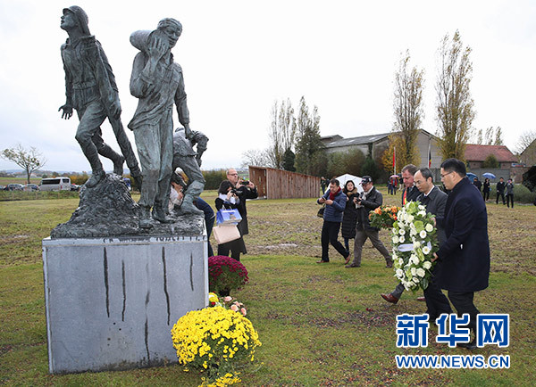 11月10日,在在比利時(shí)西佛蘭德省波珀靈厄市華工雕像園,中國(guó)駐比利時(shí)大使曹忠明(右二)、波珀靈厄市市長(zhǎng)克里斯托弗·德雅蓋(右三)等向華工雕像敬獻(xiàn)花圈。 新華社記者 葉平凡 攝