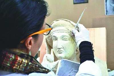 12月5日,在敘利亞首都大馬士革,文物修復師赫芭·朱馬在國家博物館內(nèi)修復來自巴爾米拉的受損雕像。新華社發(fā)