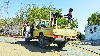 11月15日,在也門荷臺達,支持也門政府的武裝人員在一輛軍車上。新華社發(fā)