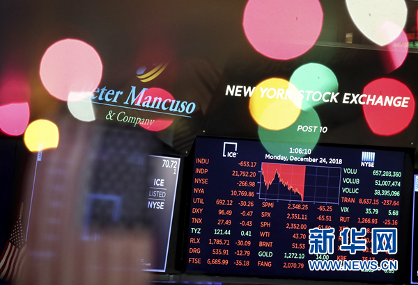12月24日,美國紐約證券交易所的電子屏顯示當(dāng)日交易信息。 紐約股市三大股指24日收盤下跌。截至當(dāng)天收盤,道瓊斯工業(yè)平均指數(shù)比前一交易日下跌653.17點(diǎn),收于21792.20點(diǎn),跌幅為2.91%。標(biāo)準(zhǔn)普爾500種股票指數(shù)下跌65.52點(diǎn),收于2351.10點(diǎn),跌幅為2.71%。納斯達(dá)克綜合指數(shù)下跌140.08點(diǎn),收于6192.92點(diǎn),跌幅為2.21%。 新華社記者 王迎 攝