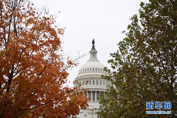 這張2018年11月6日拍攝的資料照片顯示,在美國華盛頓,國會大廈掩映在樹木之間。 新華社記者 劉杰 攝