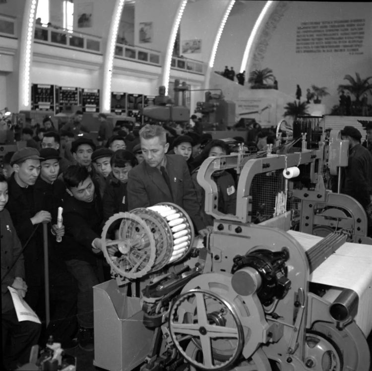 ↑上海,觀眾在蘇聯(lián)經(jīng)濟(jì)及文化建設(shè)成就展覽會(huì)上參觀蘇聯(lián)制造的自動(dòng)織布機(jī).(1955年3月15日,楊溥濤)