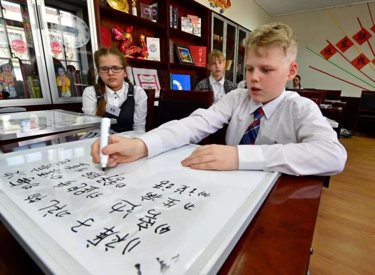 ↑俄羅斯學(xué)生在符拉迪沃斯托克遠(yuǎn)東聯(lián)邦大學(xué)孔子學(xué)院書寫漢字。(2017年,尤里·斯米秋克)