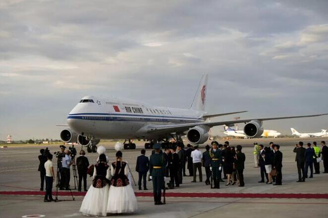 6月12日,國家主席習(xí)近平乘專機(jī)抵達(dá)比什凱克,開始對吉爾吉斯共和國進(jìn)行國事訪問并出席上海合作組織成員國元首理事會第十九次會議。吉爾吉斯斯坦總統(tǒng)熱恩別科夫在舷梯旁熱情迎接。新華社記者 謝環(huán)馳 攝