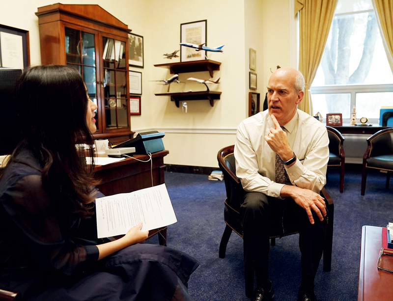 越來越多美國有識之士認識到,美國政府加征關稅會損害美國民眾利益。圖為2019年5月9日,美國國會眾議院美中工作小組共同主席、華盛頓州民主黨聯(lián)邦眾議員里克·拉森(右)在華盛頓接受采訪時表示,美國政府對華產品加征關稅的做法損害美國工人與消費者利益,不利于美國經濟,也無助于解決兩國經貿問題。 新華社記者 劉杰/攝
