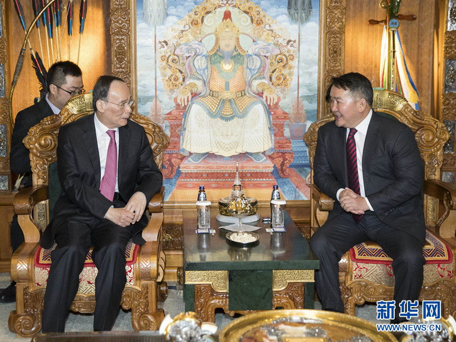 會(huì)見(jiàn)巴特圖勒嘎時(shí),王岐山表示,建交70年來(lái),友好合作始終是中蒙關(guān)系主流。當(dāng)前兩國(guó)關(guān)系站在新的歷史起點(diǎn)上。中蒙要牢牢把握正確政治方向,做互尊互信的戰(zhàn)略伙伴、互利互惠的合作伙伴、常來(lái)常往的友好伙伴、互幫互助的多邊合作伙伴。中方愿同蒙方一道努力,保持高層引領(lǐng),鞏固政治互信,深化互利合作與民間交流,加強(qiáng)地區(qū)國(guó)際合作,不斷充實(shí)全面戰(zhàn)略伙伴關(guān)系內(nèi)涵。