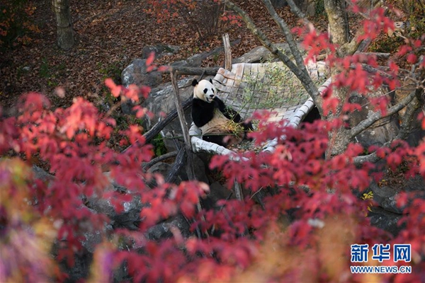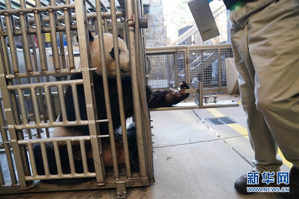 11月13日,在美國華盛頓的美國國家動(dòng)物園,大熊貓“貝貝”接受體檢后到室外活動(dòng)。新華社記者 劉杰 攝