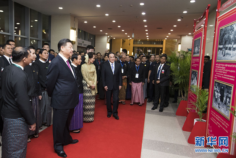 儀式開始前,習近平在緬方領(lǐng)導人陪同下,觀看了慶祝中緬建交70周年圖片展。圖片展記錄了中緬建交70年來雙方交往中的一幕幕感人畫面。習近平不時駐足,認真聽取講解并仔細觀看。
