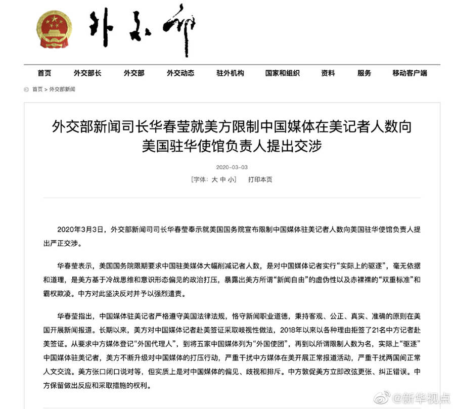 外交部新聞司司長華春瑩3日奉示就美國國務(wù)院宣布限制中國媒體駐美記者人數(shù)向美國駐華使館負(fù)責(zé)人提出嚴(yán)正交涉。華春瑩表示,美國國務(wù)院限期要求中國駐美媒體大幅削減記者人數(shù),是對中國媒體記者實(shí)行“實(shí)際上的驅(qū)逐”,毫無依據(jù)和道理,是美方基于冷戰(zhàn)思維和意識形態(tài)偏見的政治打壓,暴露出美方所謂“新聞自由”的虛偽性以及赤裸裸的“雙重標(biāo)準(zhǔn)”和霸權(quán)欺凌。中方對此堅(jiān)決反對并予以強(qiáng)烈遣責(zé)。中方敦促美方立即改弦更張、糾正錯誤。中方保留做出反應(yīng)和采取措施的權(quán)利。(記者朱超)