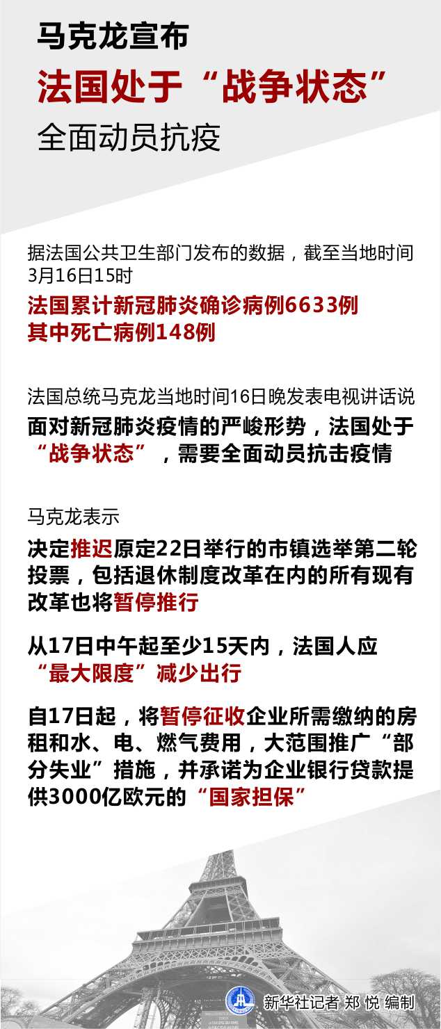 新華社巴黎3月16日電(記者徐永春 唐霽 陳晨)法國總統(tǒng)馬克龍16日晚發(fā)表電視講話說,面對新冠肺炎疫情的嚴峻形勢,法國處于“戰(zhàn)爭狀態(tài)”,需要全面動員抗擊疫情。