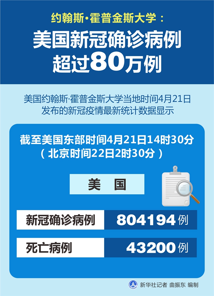 新華社紐約4月21日電? 美國約翰斯·霍普金斯大學21日發(fā)布的新冠疫情最新統(tǒng)計數(shù)據(jù)顯示,截至美國東部時間21日14時30分(北京時間22日2時30分),美國新冠確診病例升至804194例,死亡病例為43200例。