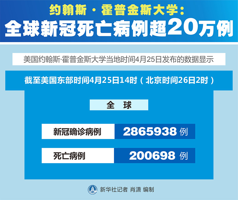 新華社紐約4月25日電? 美國約翰斯·霍普金斯大學(xué)25日發(fā)布的新冠疫情最新統(tǒng)計數(shù)據(jù)顯示,全球新冠死亡病例超過20萬例。