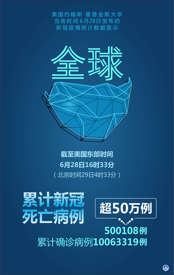 新華社北京6月29日電? 28日全球疫情簡報:美機構統(tǒng)計全球累計新冠病例超1000萬 死亡超50萬