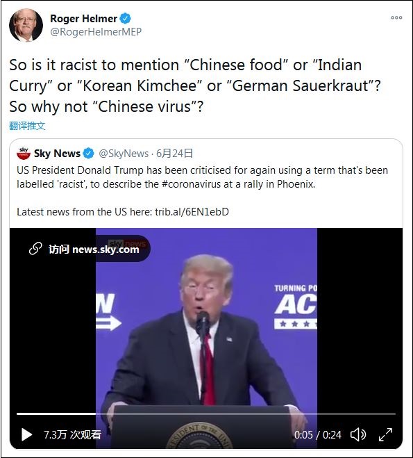 6月24日,赫爾默轉(zhuǎn)發(fā)了特朗普集會(huì)上喊“功夫病毒”的視頻,并評(píng)論稱:“說中國(guó)菜、印度菜、韓國(guó)泡菜或德國(guó)酸菜是種族歧視嗎?那么,為什么‘中國(guó)病毒’(是呢)?”