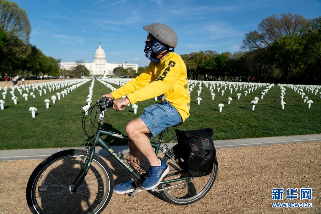 4月13日,一名男子騎車經(jīng)過美國華盛頓國家廣場(chǎng)草坪上擺放的白色絹花。