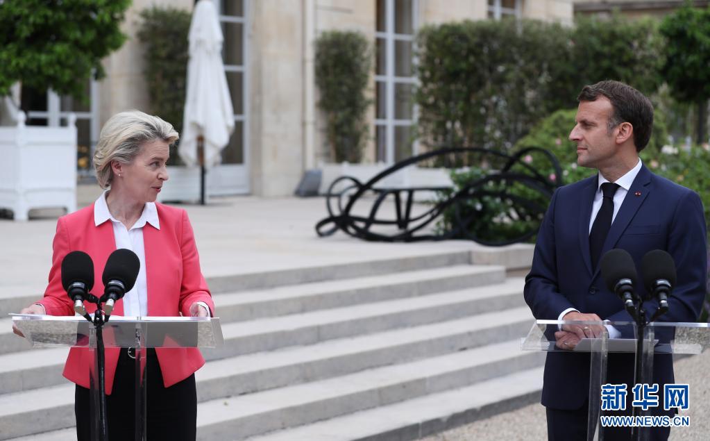 6月23日,法國(guó)總統(tǒng)馬克龍(右)與歐盟委員會(huì)主席馮德萊恩在巴黎總統(tǒng)府愛麗舍宮出席新聞發(fā)布會(huì)。