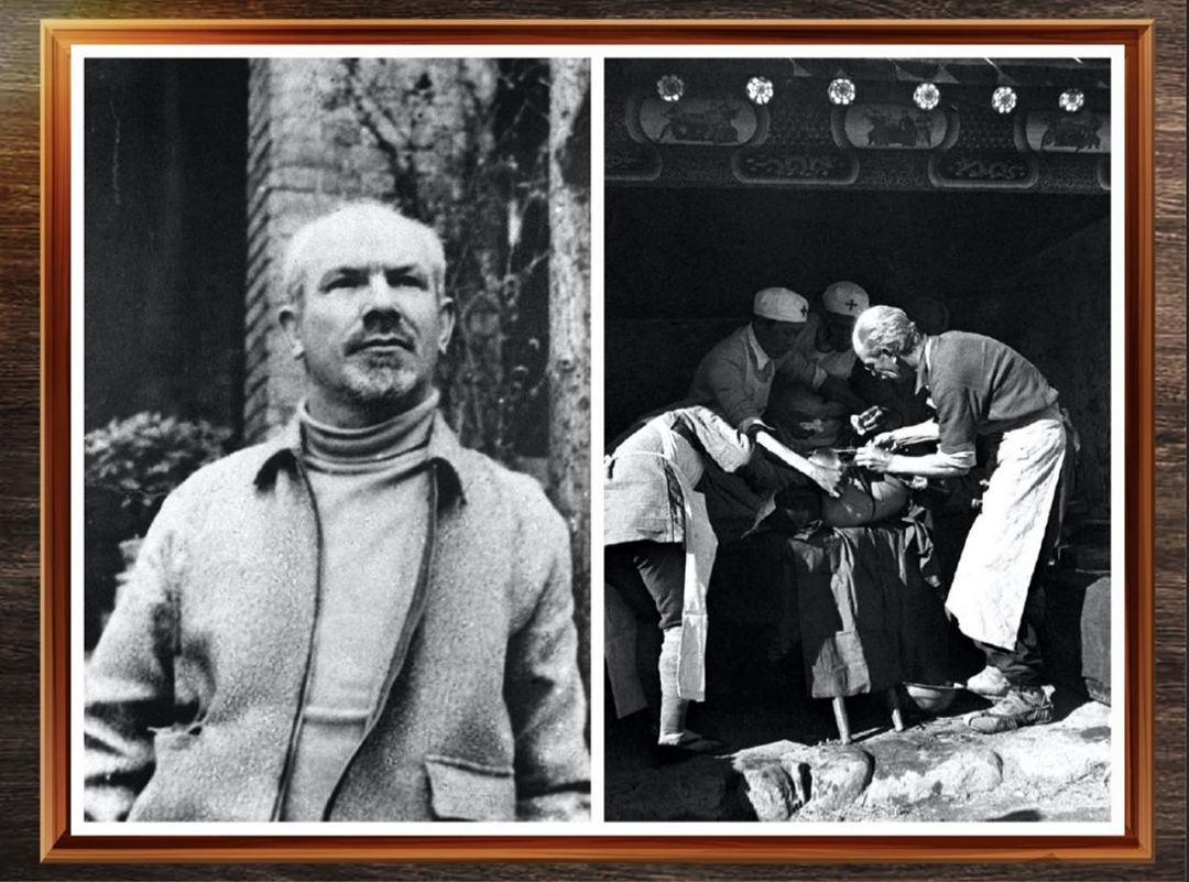 左图是白求恩;右图是白求恩在晋察冀边区涞源县临时手术室里为伤员做手术。