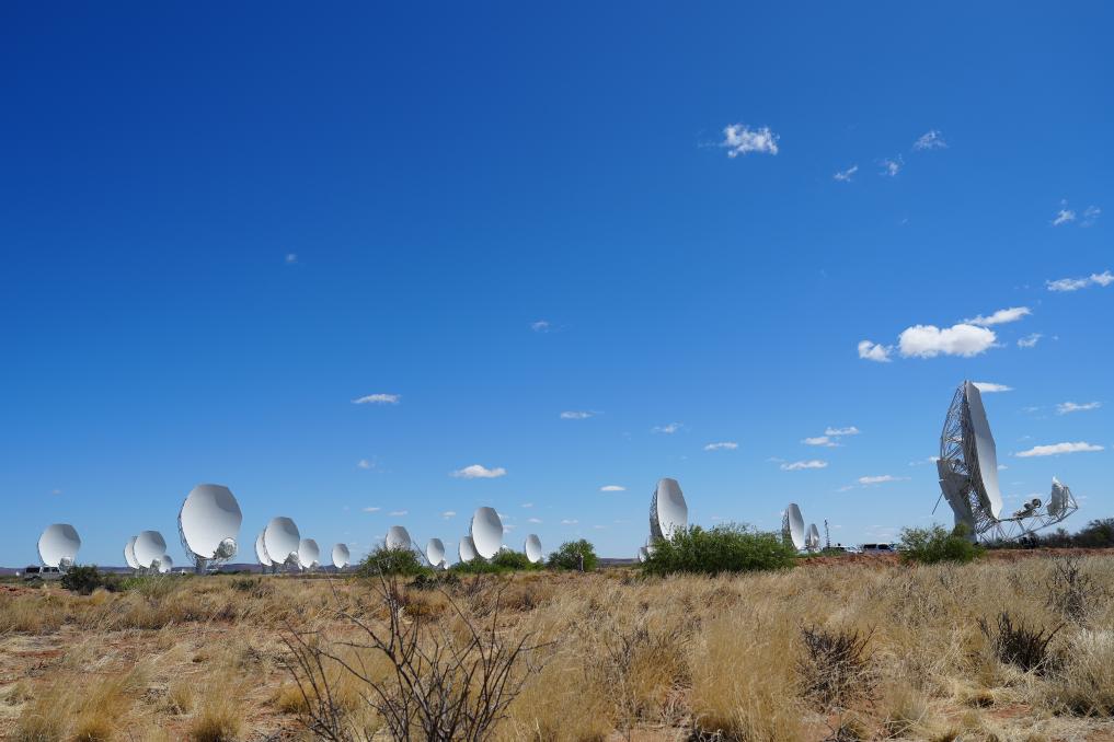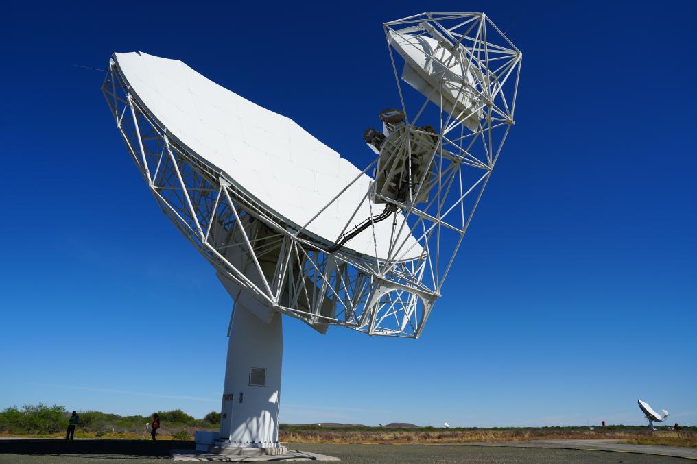 在距离MeerKAT射电望远镜不远处,伫立着3台看起来略微不同的碟状天线,它们是由中国电科网络通信研究院负责设计制造的SKA中频天线,也在不时地旋转方向和调整仰角。